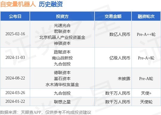 证券之星消息,根据天眼查APP于2月16日公布的信息整理,自变量机器人科技(济南)有限公司Pre-A++轮融资,融资额数亿人民币,参与投资的机构包括光速光合,君联资本,北京机器人产业投资基金,神骐资本。